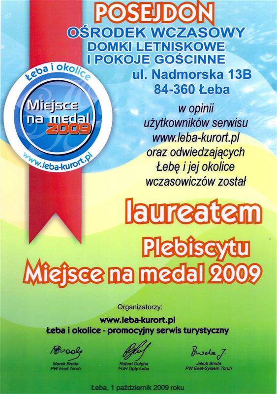 W 2009 roku Ośrodek Wczasowy POSEJDON w opinii użytkowników serwisu www.leba-kurort.pl oraz odwiedzających Łebę i okolice turystów został laureatem plebiscytu Miejsce na medal 2009.